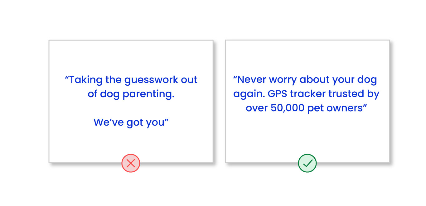 This messaging is from a website that sells GPS trackers for dogs. A valuable tool for an owner who’s terrified of losing their beloved pet. But not only has the website failed to describe the problem their product solves, they’ve also neglected to tell us why we should buy from them.