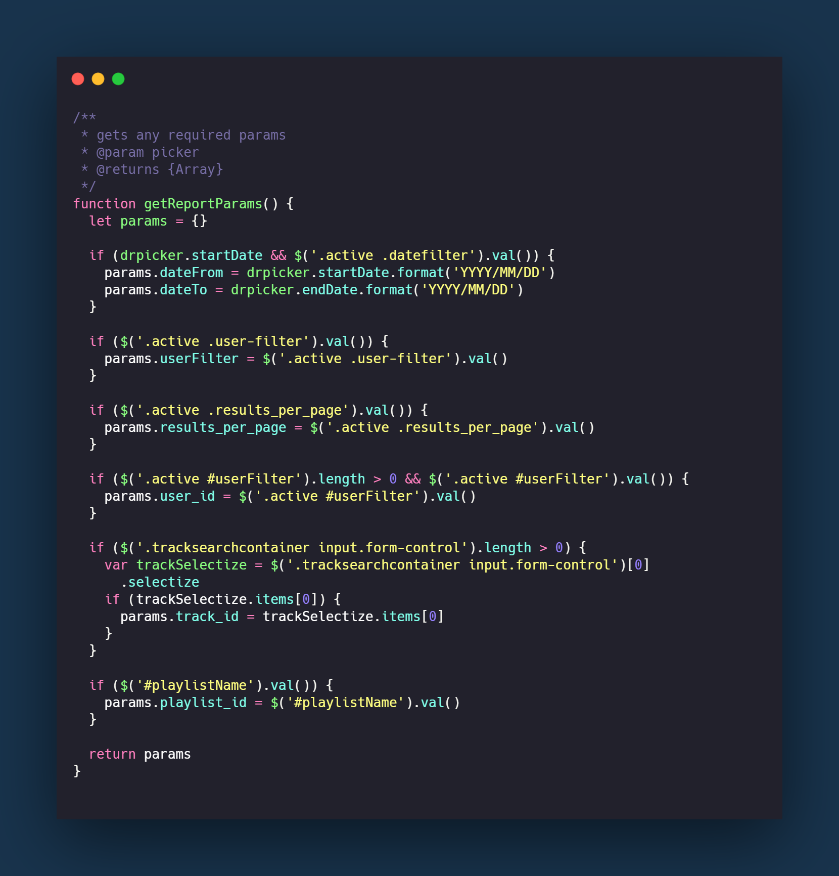 Using the getReportParams function, all of the filtered data is retrieved and added to an object named params which is used in the AJAX call to retrieve the updated, filtered reports.