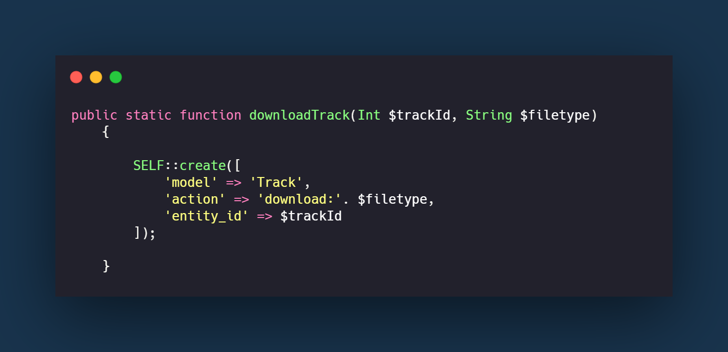 When an action we’d like to report on is made by a user, the relevant function for the action on the UserLog mode is called. In this example, the downloadTrack function is called on the UserLog model when downloading a track. This passes in the relevant data that we would like to store and display in the reports; in this case, it is the track id and the filetype.