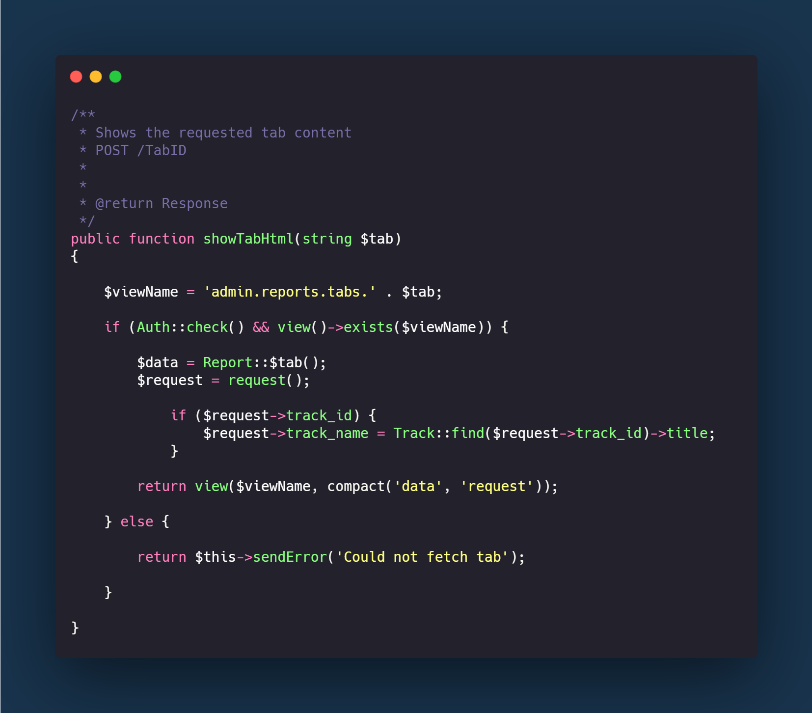 We created this PHP function to be called by the AJAX request to get a tab’s content. In here, the name of the tab is pulled from the request and is used to query the Report model for the data for that tab. In the report model, there are functions with each one corresponding to a tab and containing the SQL query to retrieve the required data.