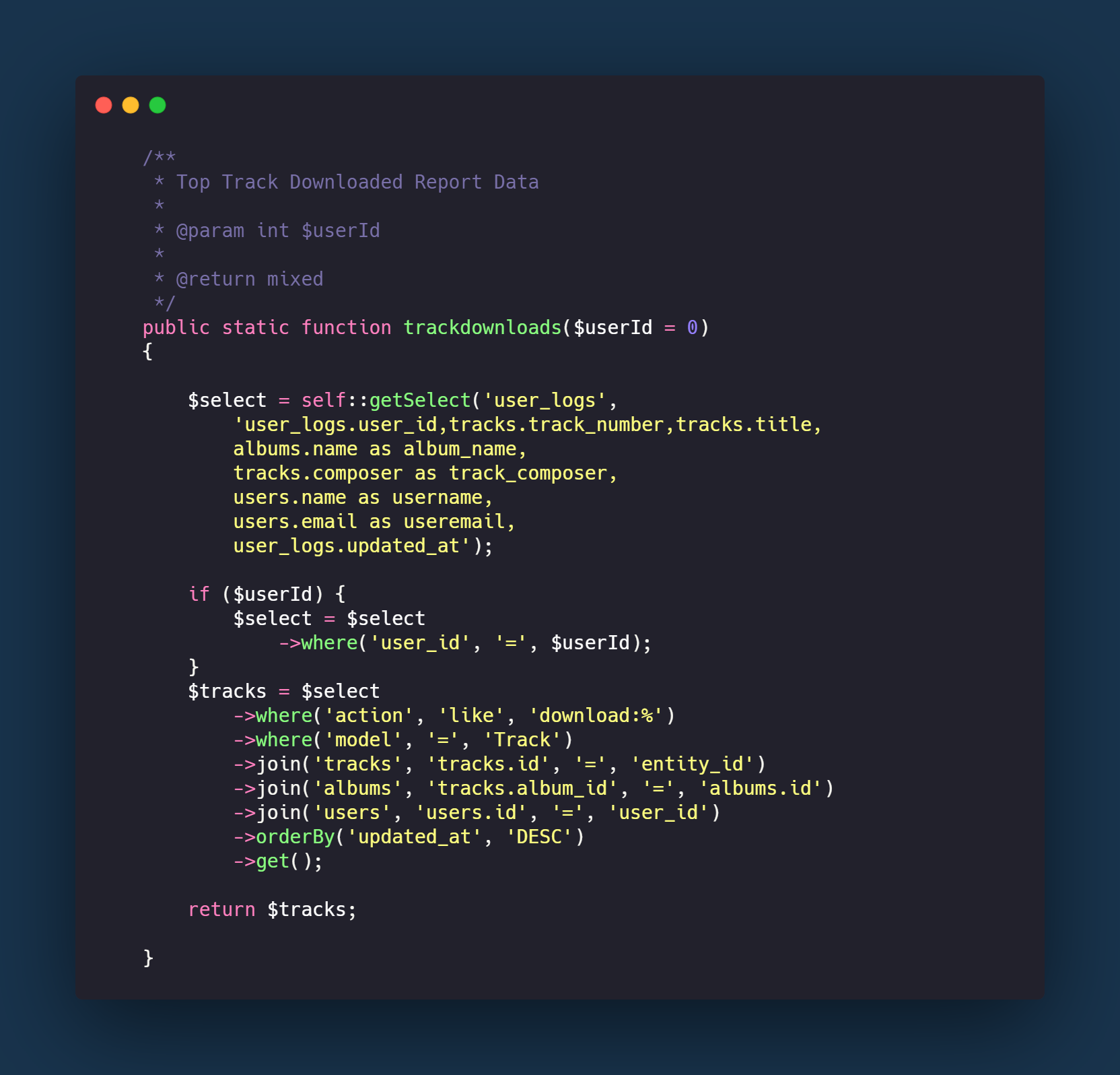 In this specific function, to get the track downloads from the database, the ‘user_logs’ table is queried and results are returned and filtered by the action containing the text ‘download’, as well as the model field being defined as ‘Track’. Once the track and album have been joined to this query to also return the track/album data, the data can then be sorted and grouped by track, returning this data: