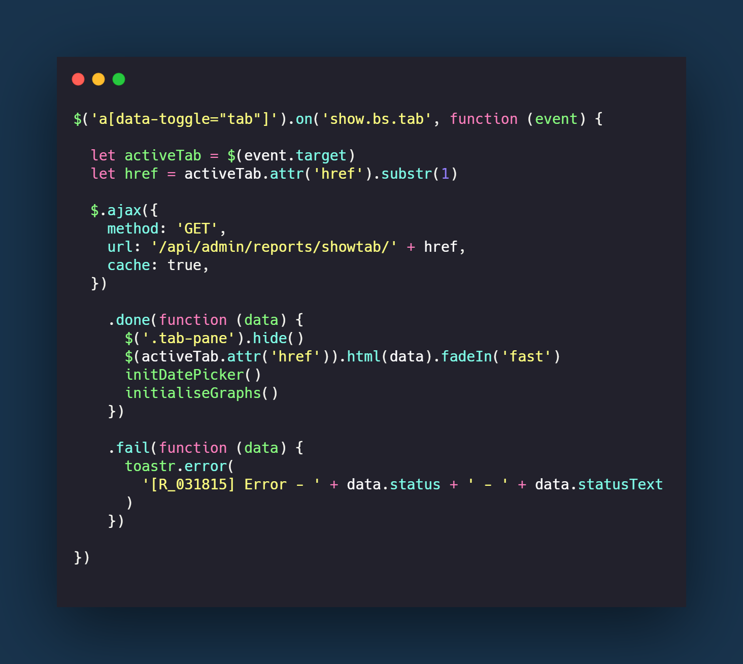 On the events emitted when the date picker value is changed, when the filters are changed, or when the number of results to show per page is changed, I call the function updateReportData (here shown in the user filter example), which runs the AJAX request again, with the newly updated parameters which are retrieved by calling the function getReportParams, and then the tab’s content is replaced with the updated, returned content that reflects the change made in the filters.