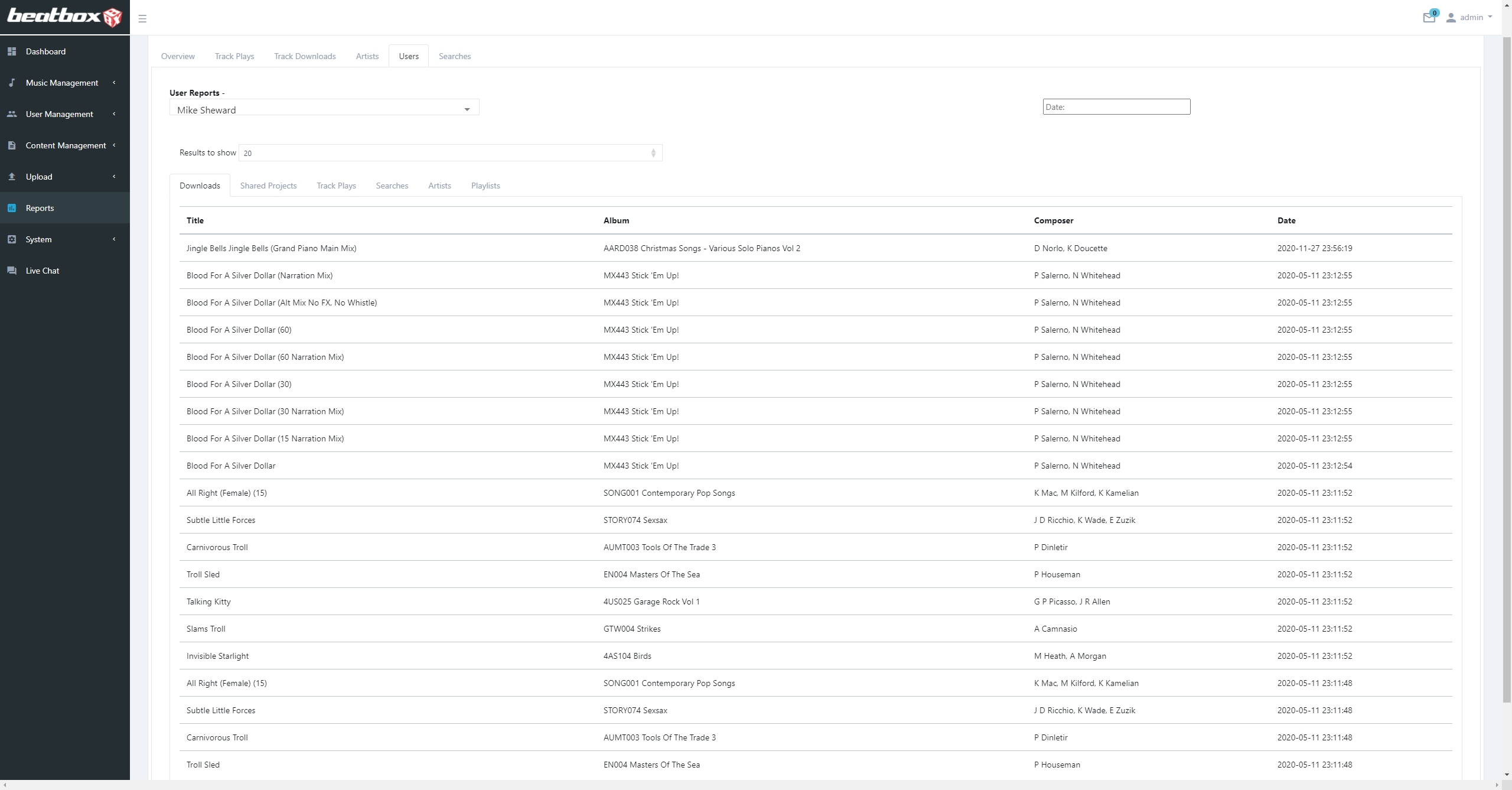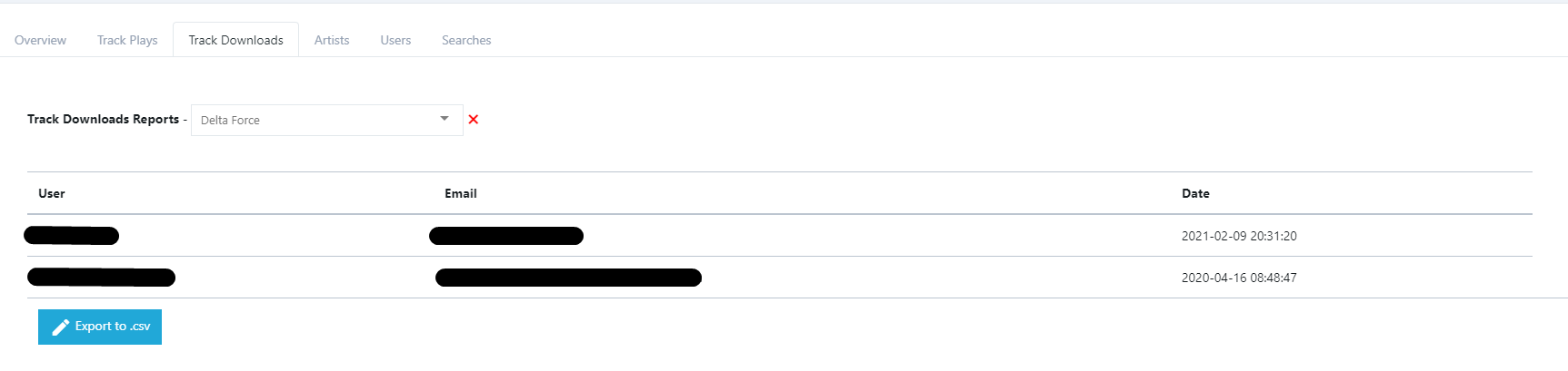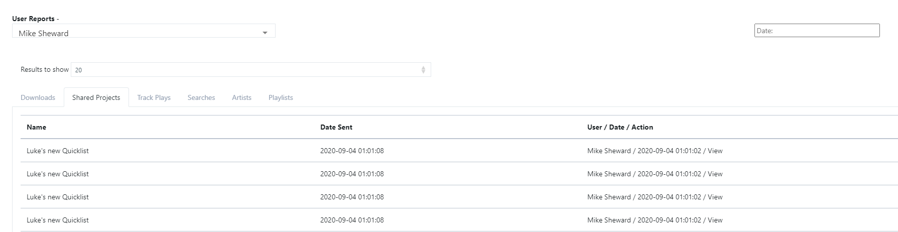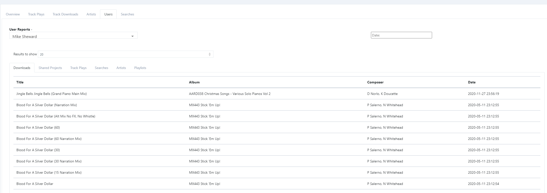 In the user reports section, I included a filter to display the results for a single user. This nests another layer of tabs within the user section to view each track that specific user downloaded/played, the tracks and projects they shared and when, as well as what they searched and what playlist/artist they played from.