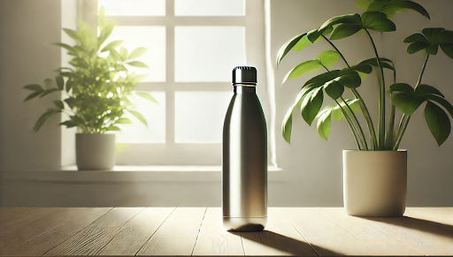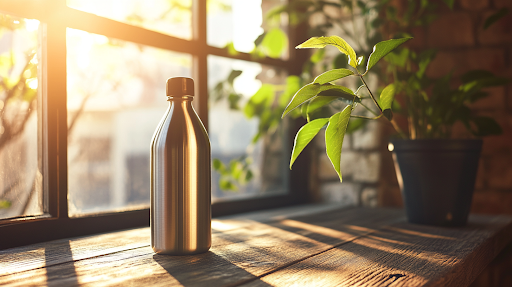 Prompt: minimalist modern metal water bottle on a wooden table, with sunrise sunlight streaming through a window. Include a leafy green plant in the background.